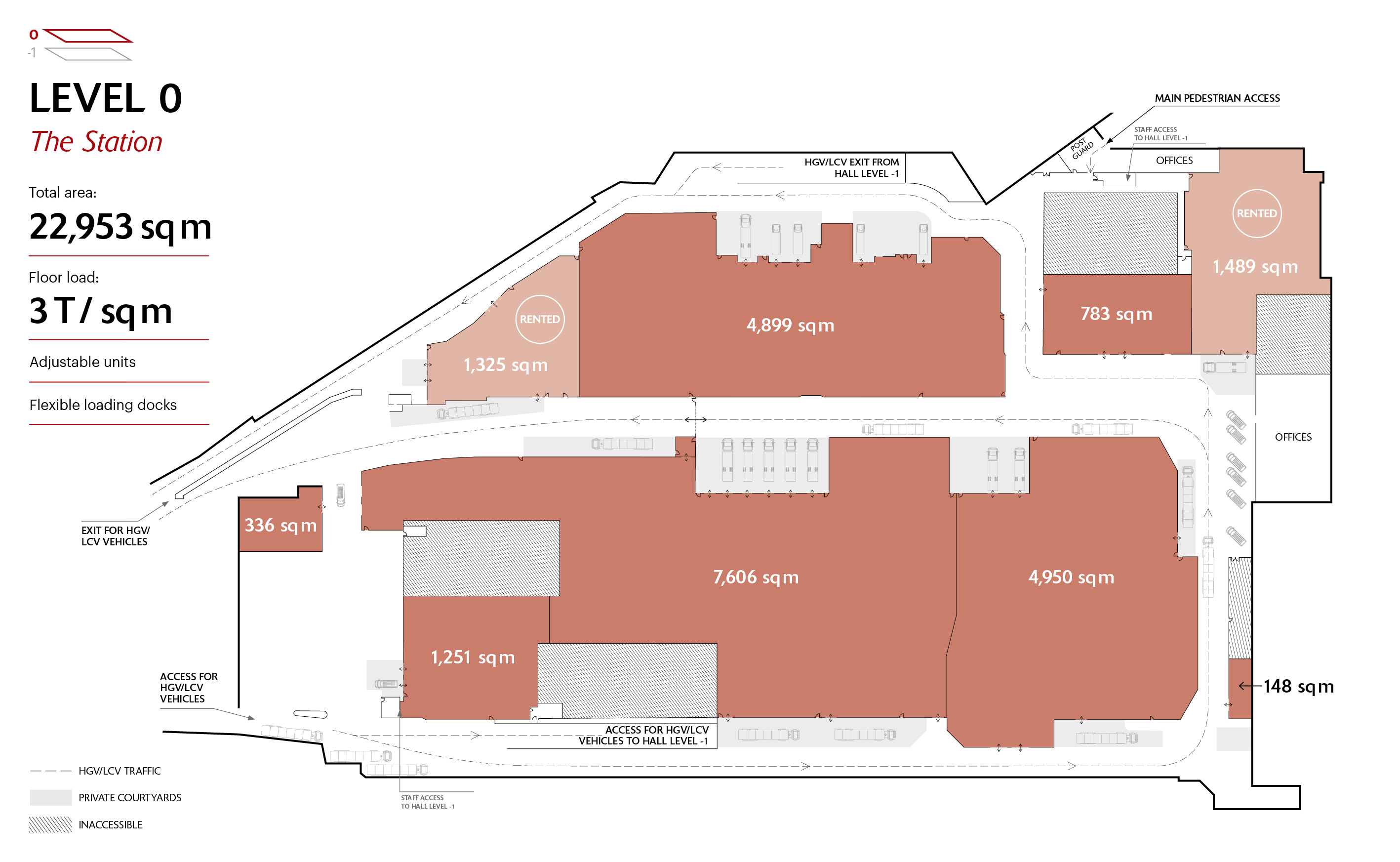 - Clearance heights: up to 5 m level 0 (Station) and 7 m level -1 (Hall)