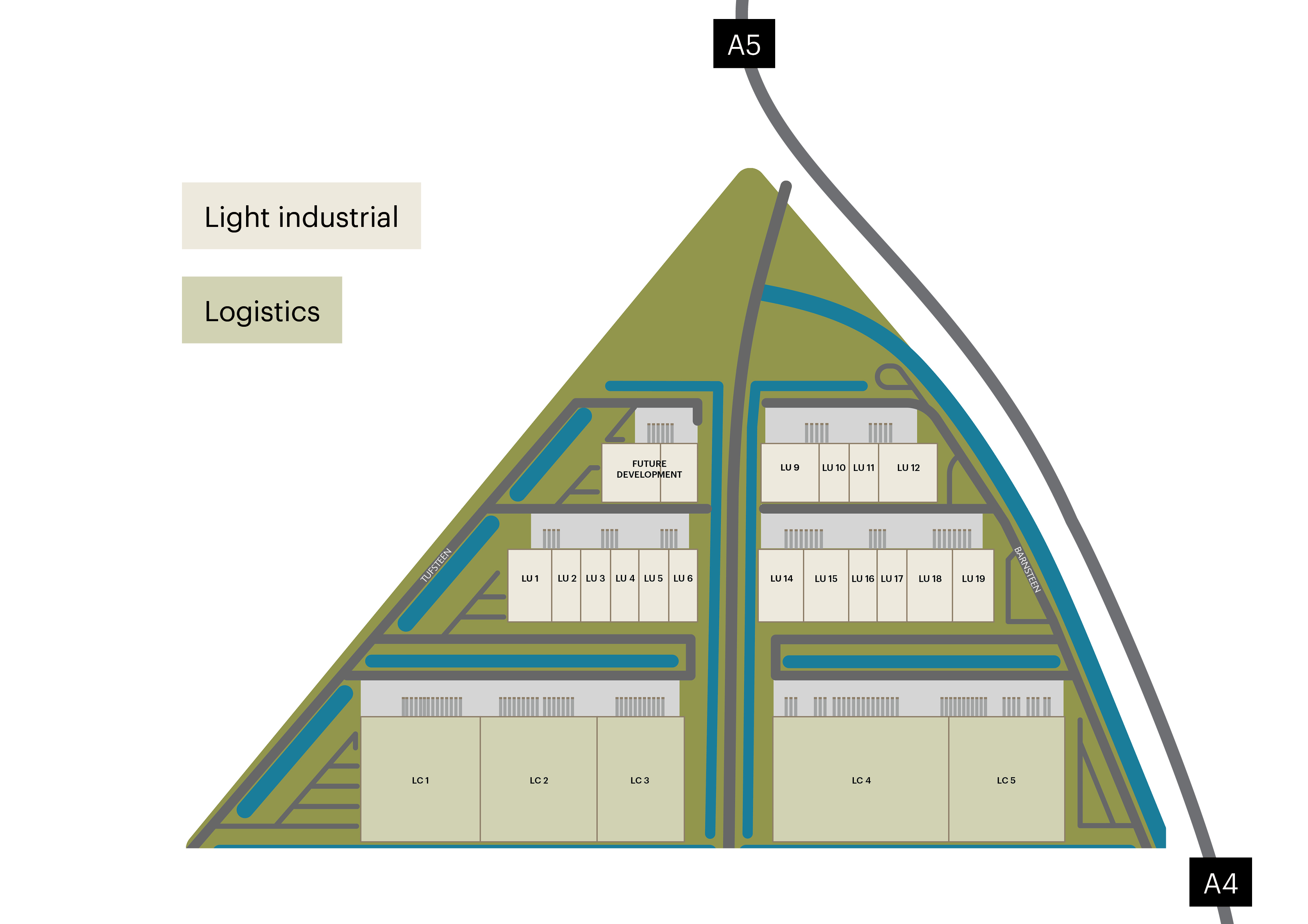 This high-quality, sustainable and gas-free logistics park has been designed with meticulous attention to detail and built using sustainable materials. All buildings hold a BREEAM Excellent certification and feature energy-efficient systems, LED lighting, underfloor heating, solar panels, ground-source energy storage and heat pumps. These measures minimise CO₂ emissions, reduce energy costs for our customers and create a comfortable working environment.