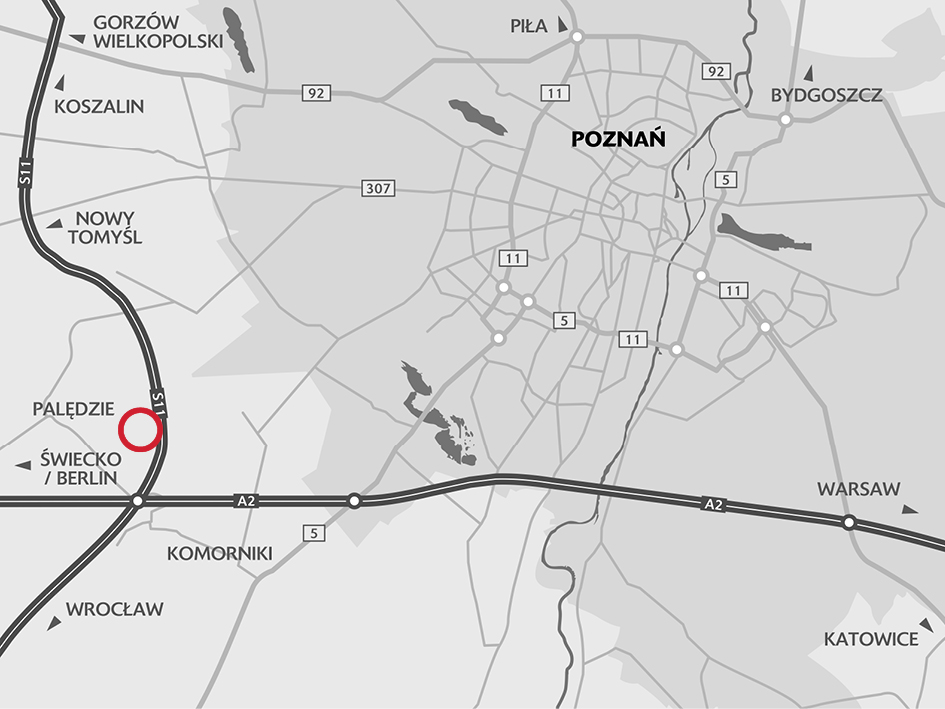 Located 5 km to the south-west from the administrative borders of Poznań and only 10 km from the city center. The proximity and easy access to the Moscow-Berlin A2 motorway and excellent visibility from the motorway and the S11 road makes it one of the best places in Poland to develop business.