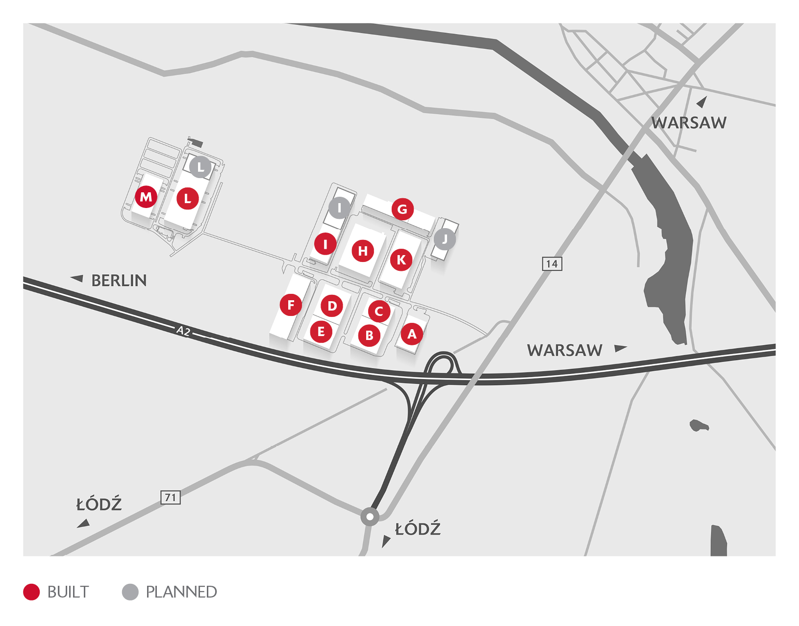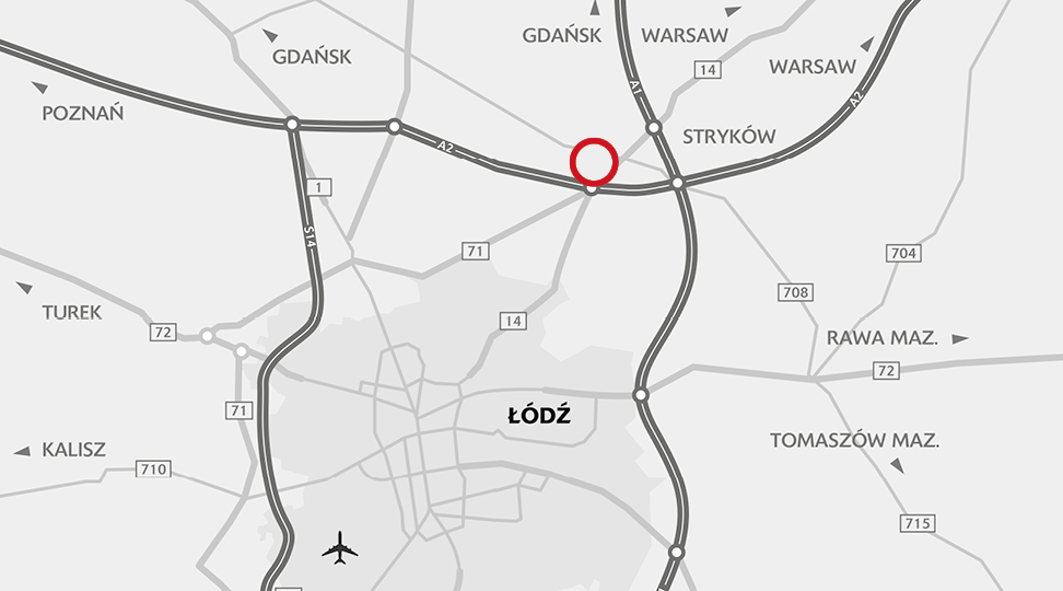 An exceptional location in the very center of Poland, 8 km from the administrative borders of Łódź (715 thousand inhabitants). The park is located directly on the A2 / E30 motorway (Berlin-Moscow), 3 km from the junction connecting the A2 motorway with A1 / E75 (Gdańsk-Vienna). Right next to the investment areas is DK14 that connects Łódź with Warsaw.