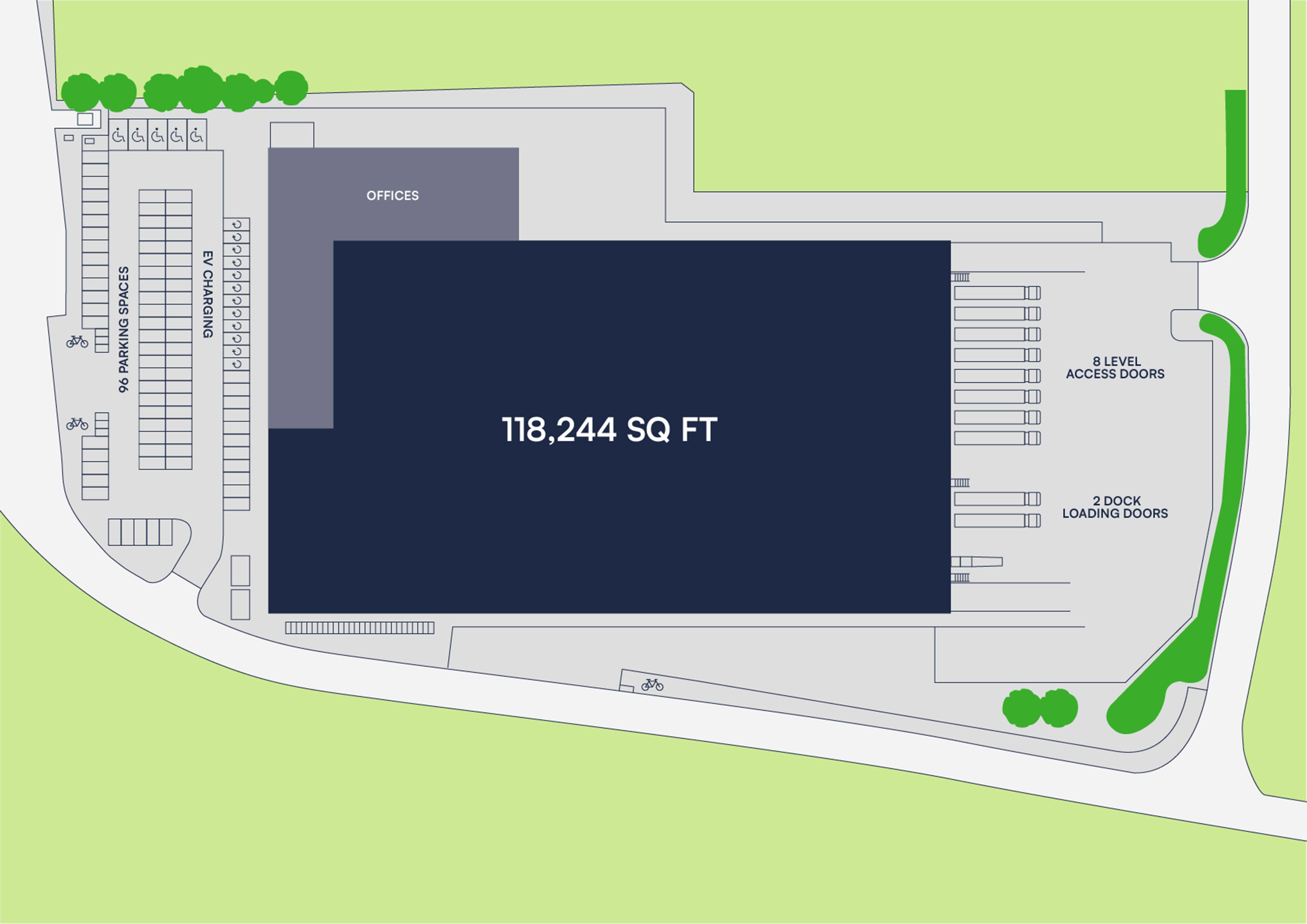 - 89 car parking spaces plus 5 disabled (5% are EV)