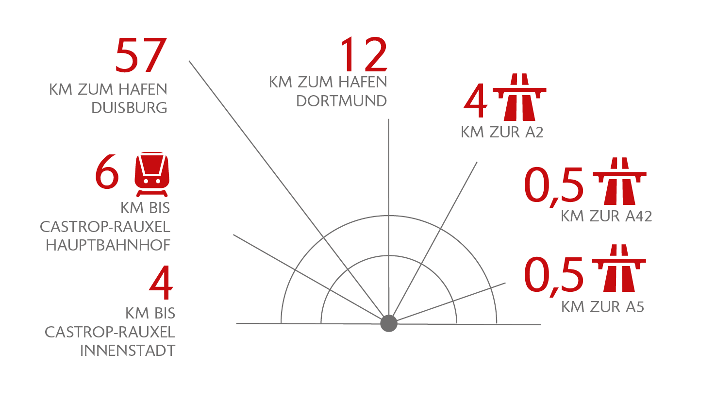 Der SEGRO Park Dortmund punktet mit seiner Lage am Autobahnkreuz Castrop-Rauxel-Ost (A42/A45). Von hier erreichen Unternehmen schnell die wichtigsten Verkehrsachsen des Ruhrgebiets.