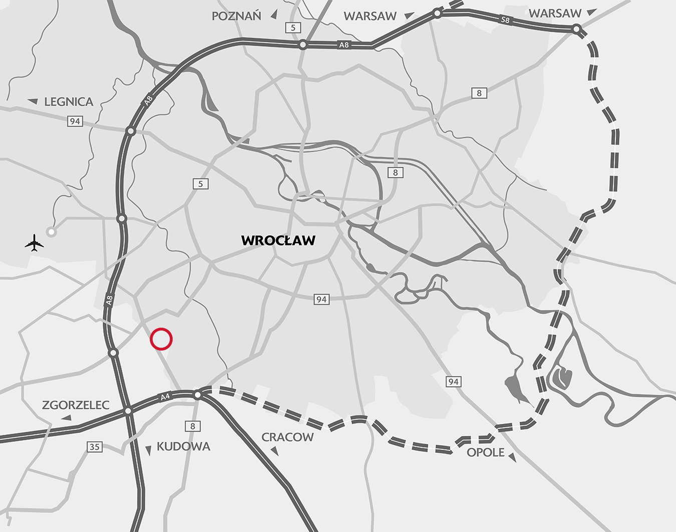 Excelente ubicación del SEGRO Park Wroclaw, Targowa ofrece fácil y cómodo acceso a la autopista A8 y a la intersección con la autopista A4, que forman parte de la TEN-T.