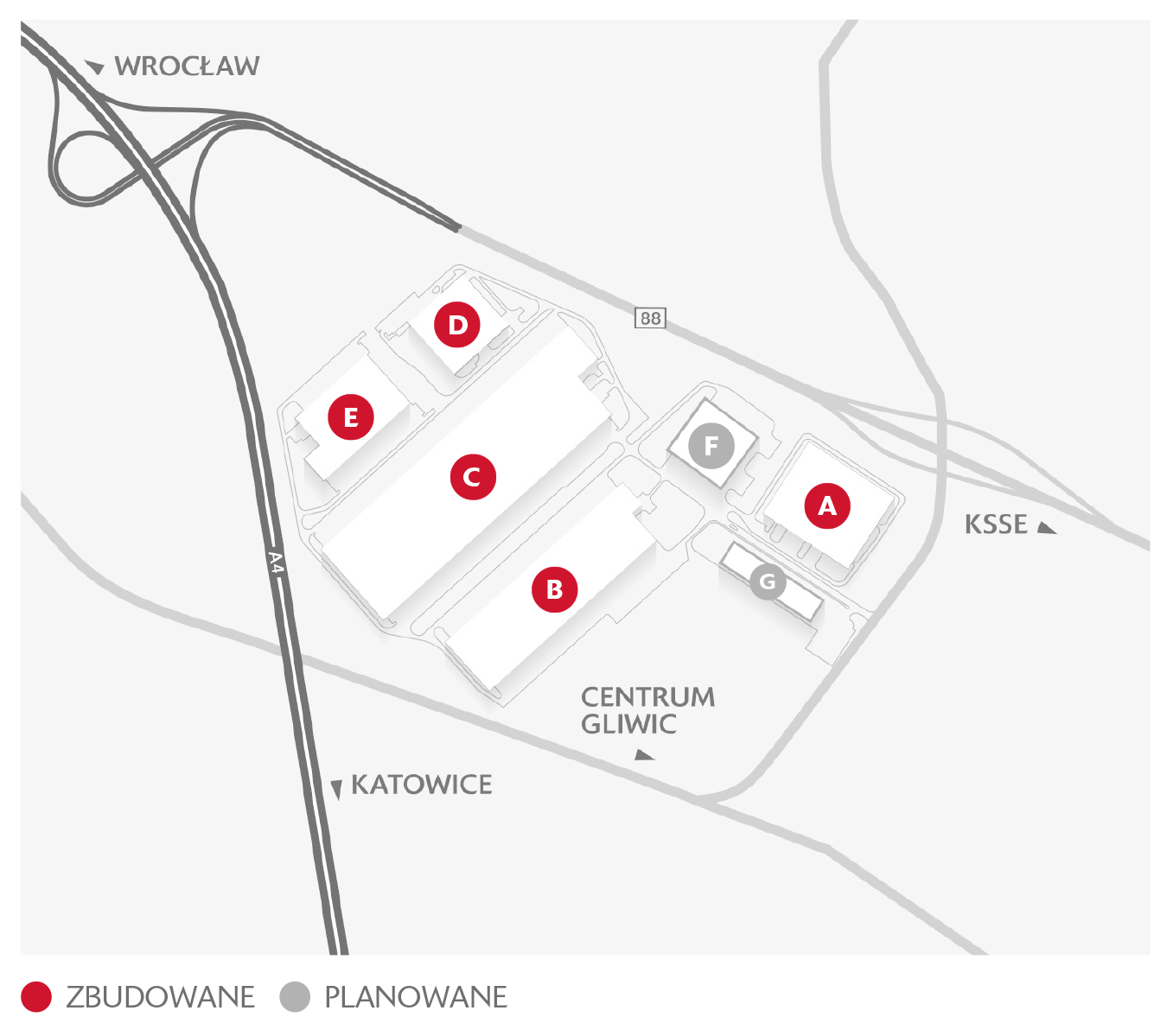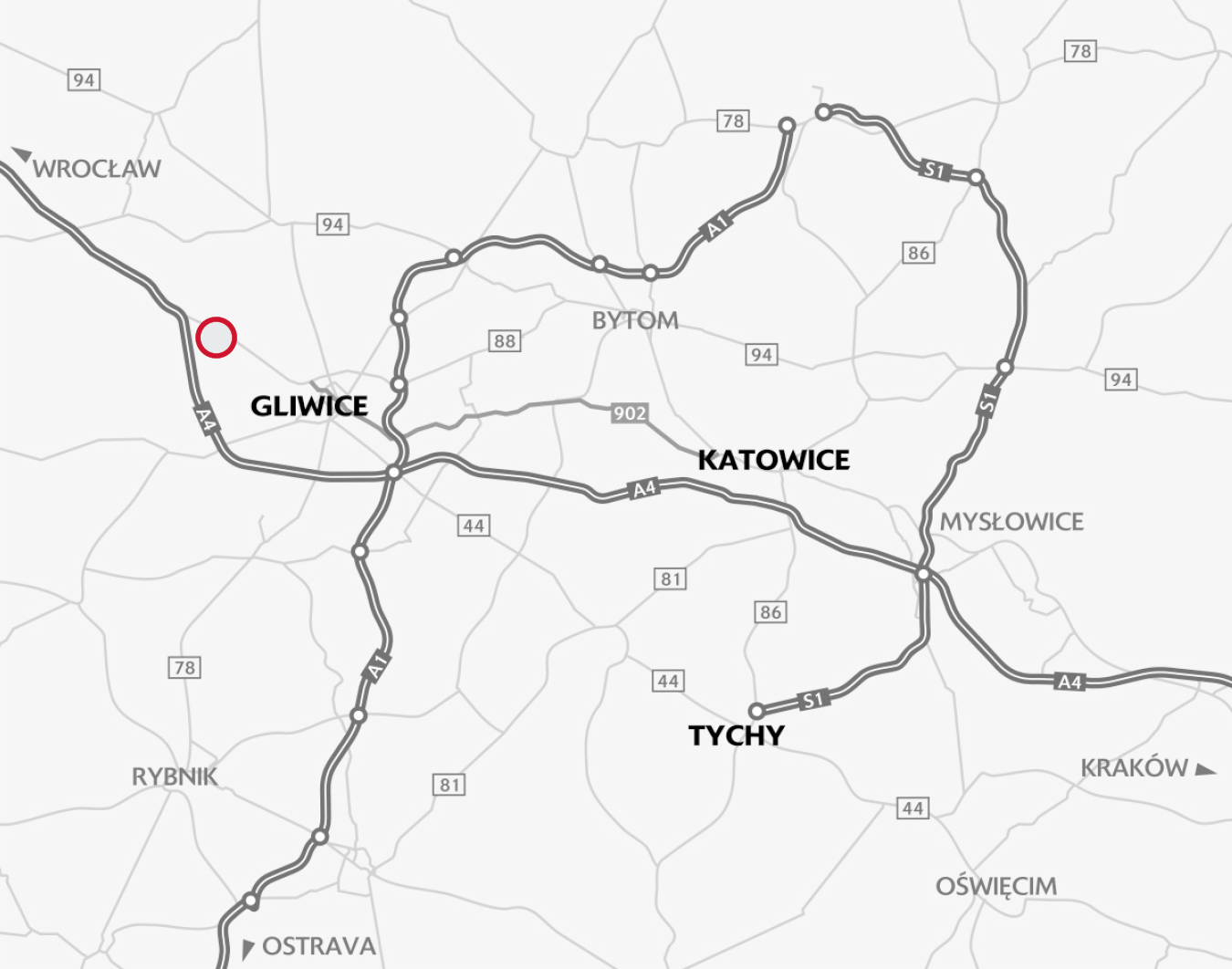 - Położony bezpośrednio przy autostradzie A4 i blisko skrzyżowania z autostradą A1